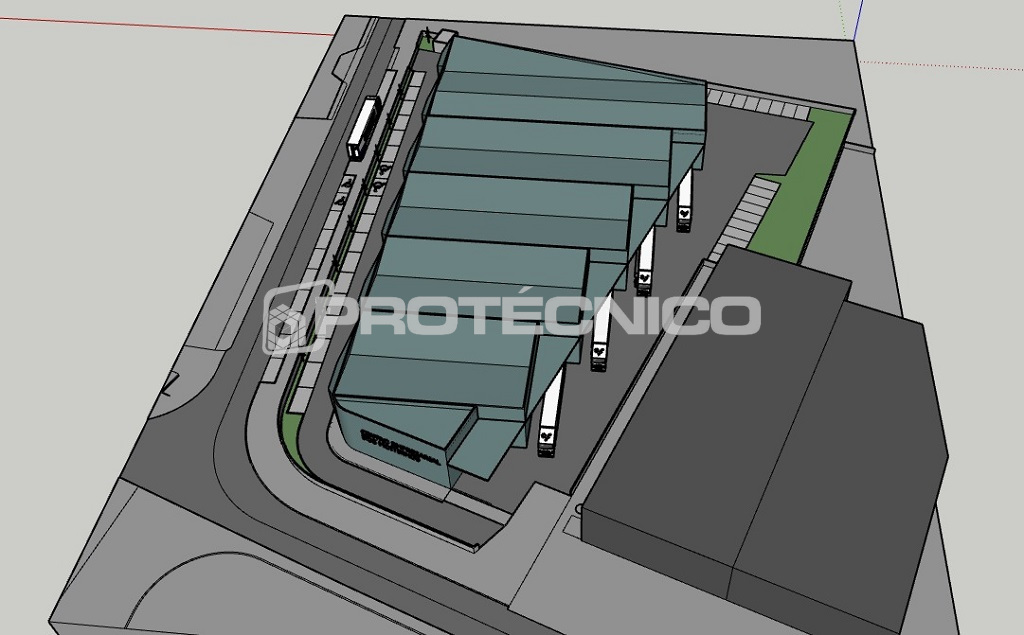 A nave dispõe de cobertura em painel sandwich e alguns painéis translúcidos o que lhe proporciona iluminação natural.